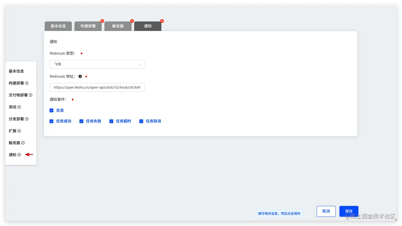 - 添加通知 -> 参考 IM 通知填写相关配置 -> 保存修改