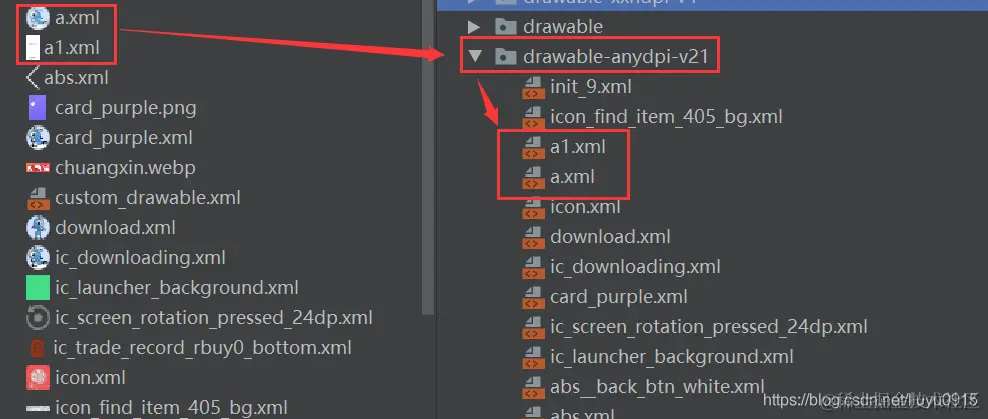 当安卓项目中有同名的图片,有矢量图和位图,例如有 矢量图 a.xml和位图a.png 两张图片,系统会优先使用矢量图。如果如上设置了兼容低版本使用矢量图,由不允许在同目录下面使用同名的图,即 a.xml和a.png是不允许在一个目录下同时使用,否则会报资源重复问题。