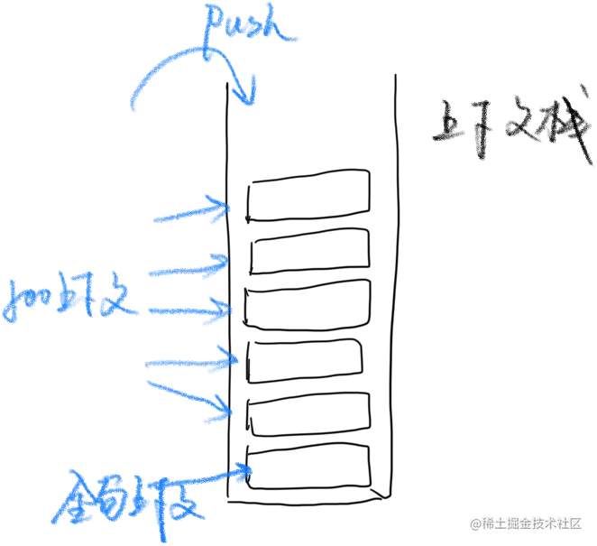 - 这个代码是在全局作用域中执行的,所以在foo函数得到执行之前,上下文栈中就已经被放入了一个全局上下文。之后执行一个函数,生成一个新的执行上下文时,JS引擎都会将新的上下文push到该栈中。如果函数执行完成,JS引擎会将对应的上下文从上下文栈中弹出