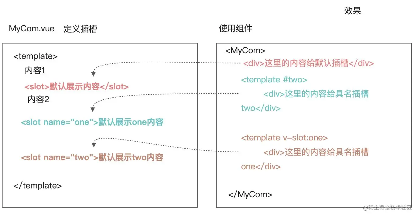 - 使用组件时, template配合#插槽名传入具体html标签或组件