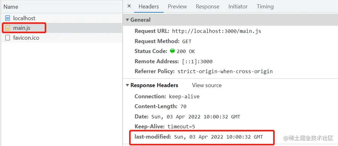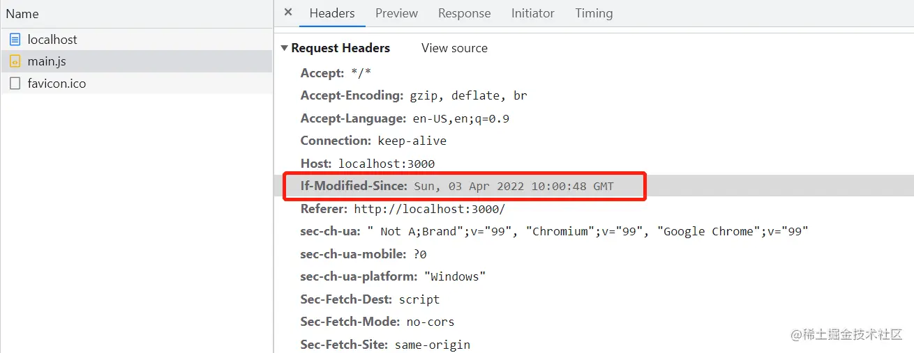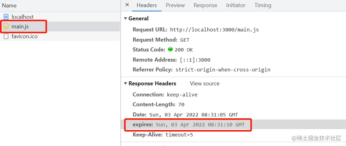 第一次访问main.js,可以看到response header中有我们指定的expires(5秒后失效)。