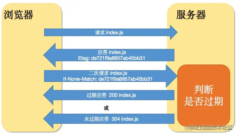 - 如果没有命中强缓存,浏览器会发送请求到服务器,请求会携带第一次请求返回的有关缓存的header字段信息(Last-Modified/If-Modified-Since和Etag/If-None-Match),由服务器根据请求中的相关header信息来比对结果是否协商缓存命中。若命中,则服务器返回新的响应header信息更新缓存中的对应header信息,但是并不返回资源内容,它会告知浏览器可以直接从缓存获取;否则返回最新的资源内容。