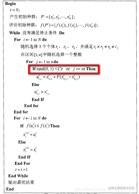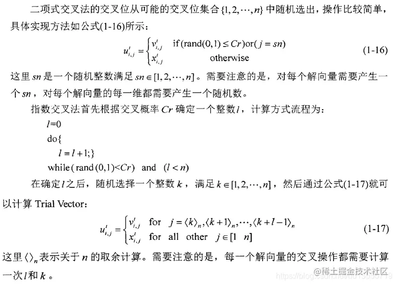 - 其中n表示决策向量的维度数,sn是一个随机整数满足[1,n],对于每个解向量需要有一个sn,对于解向量中的每一个维度需要有一个随机数Cr