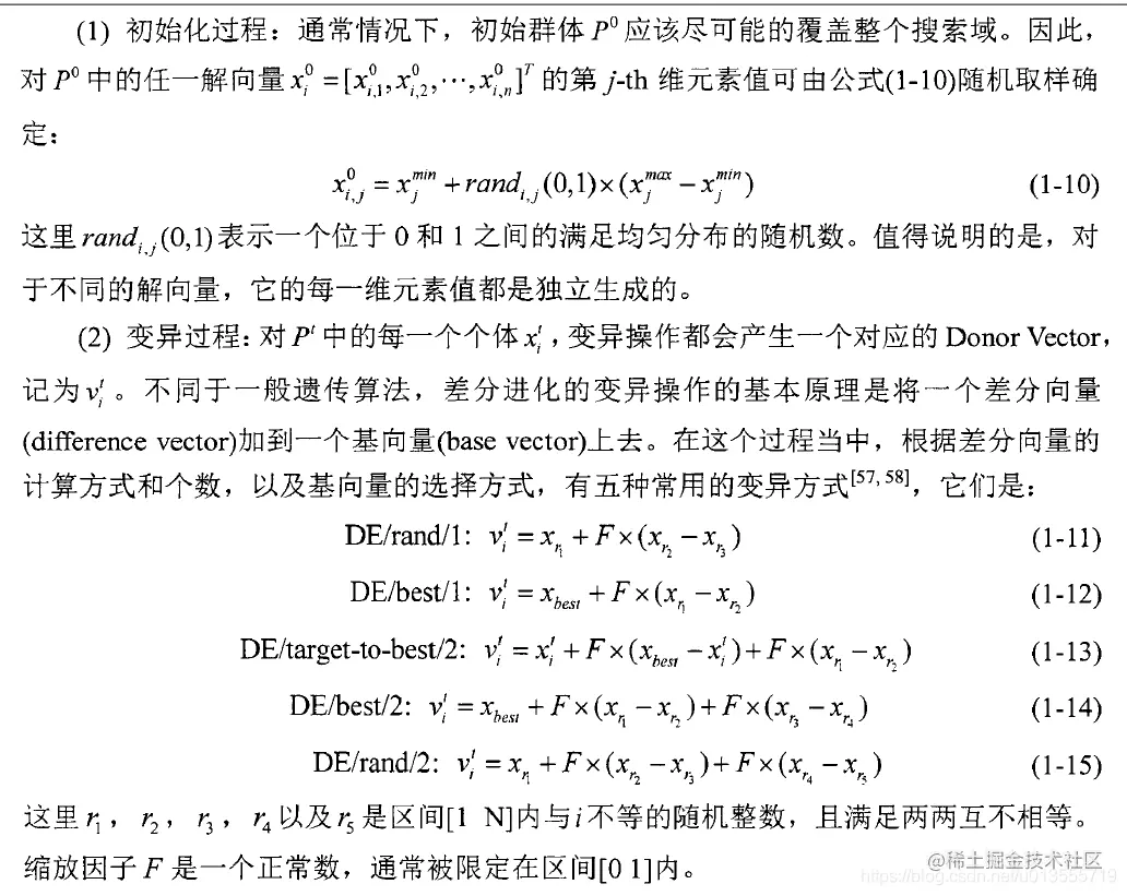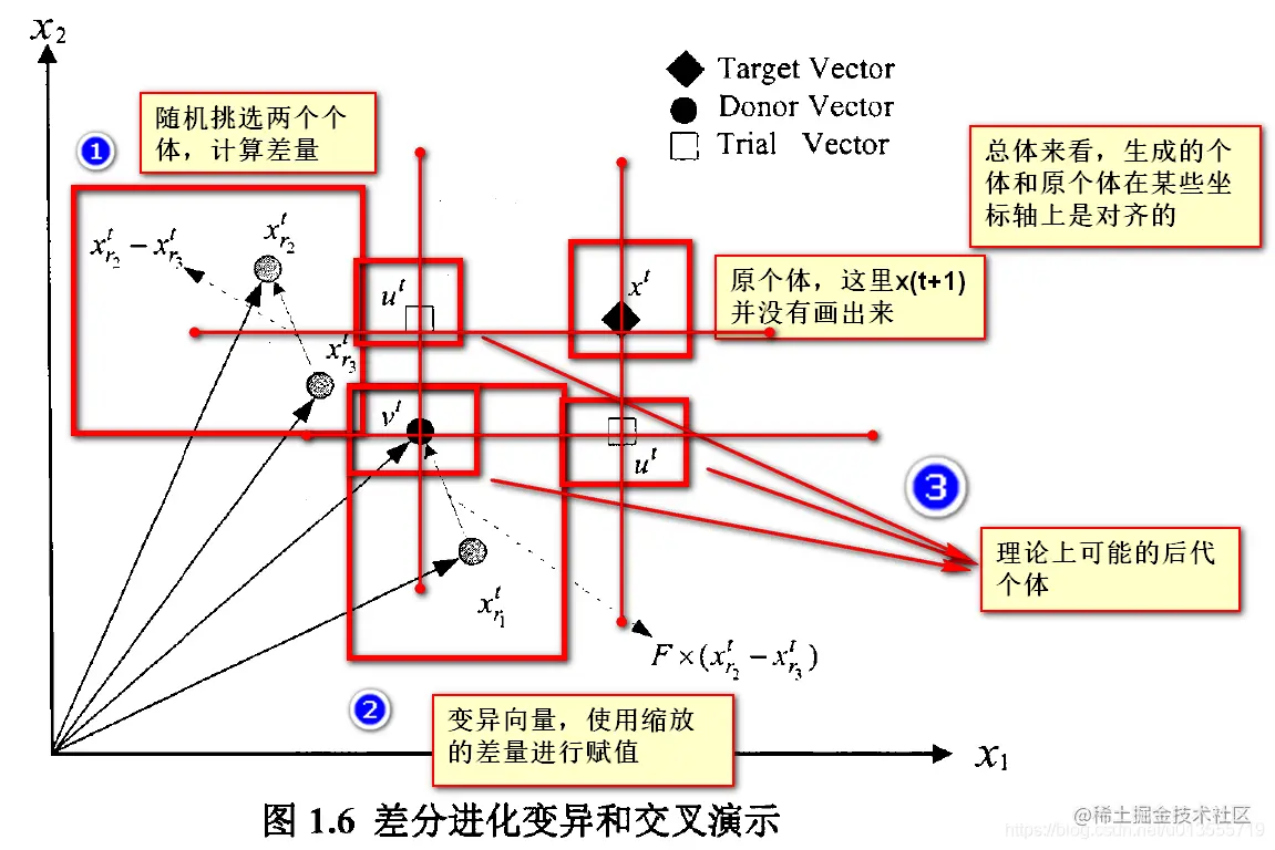- DE同样需要执行变异和交叉操作,但是,的变异是基于差分向量的,结构简单,易于实现。且一般是先执行变异操作,后执行交叉操作;