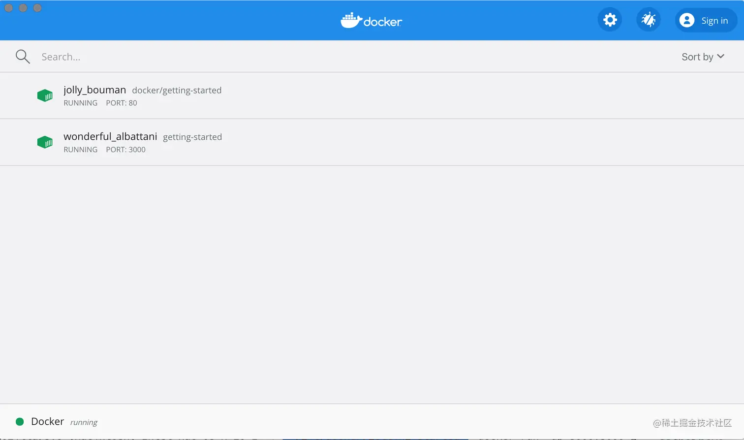 如果你快速浏览下Docker仪表盘,您将看到两个容器正在运行(本教程和您刚刚新推出的app容器)。