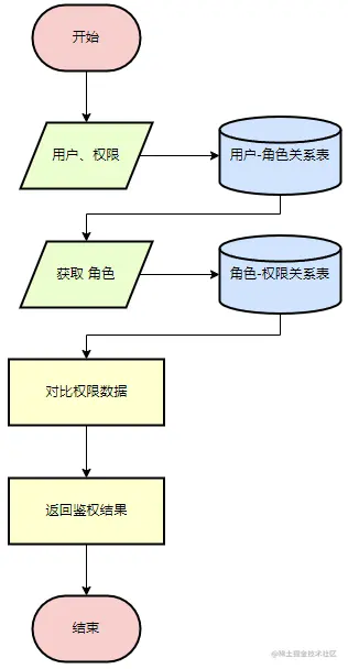 鉴权流程也非常简单,调用方传入用户和权限信息,权限系统通过 用户角色关系表 以及 角色权限关系表 便可轻松判断。