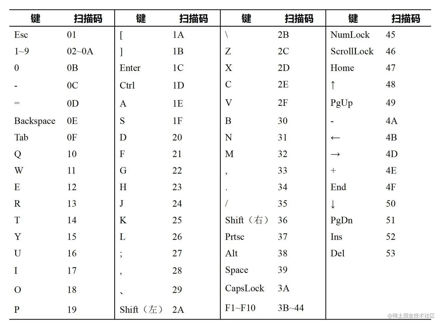 键盘上的每个按键相当于一个开关,键盘中的芯片对按键的开关状态进行扫描。按键按下和松开将产生对应的扫描码,扫描码描述了键在键盘中的位置。