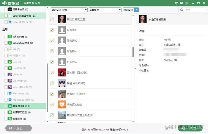 步骤三: 扫描结束后,会显示以下界面,将左侧的应用栏下拉到最底部,就会看到【微信通讯录】,点击进去,将已删除的联系人勾选,最后点击右下角的【恢复】即可。