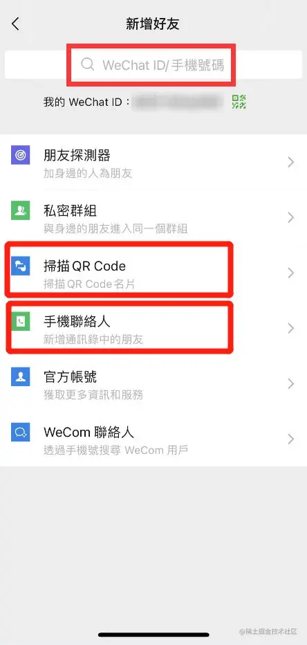 步骤二: 第一种添加方式,可以在搜索框内输入对方的微信ID或者手机号码进行搜索;第二种添加方式,可以直接面对面扫描二维码;第三种添加方式,对方为您的手机联系人,直接在通讯录中进行添加;第四种添加方式,拥有共同群聊,直接在群聊中添加。