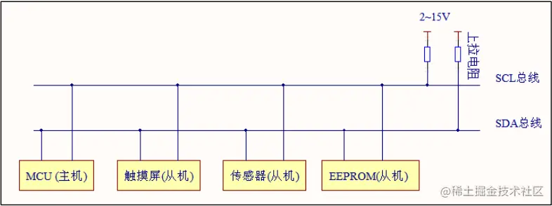I2C(Inter-Integrated Circuit ,内部集成电路) 总线是一种由飞利浦 Philip 公司开发的串行总线。是两条串行的总线,它由一根数据线(SDA)和一根 时钟线(SCL)组成。两条线都需要上拉电阻。I2C 总线上可以接多个 I2C 设备,每个器件都有一个唯一的地址识别。同一时间只能有一个主设备,其他为从设备。通常 MCU 作为主设备控制,外设作为从设备。