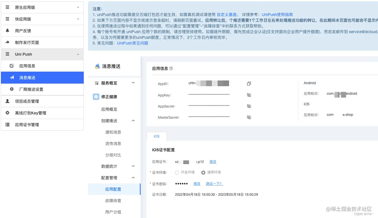 首先我们先知道在哪里配置Dcloud后台中,UniPush栏下。应用配置 就可以配置IOS