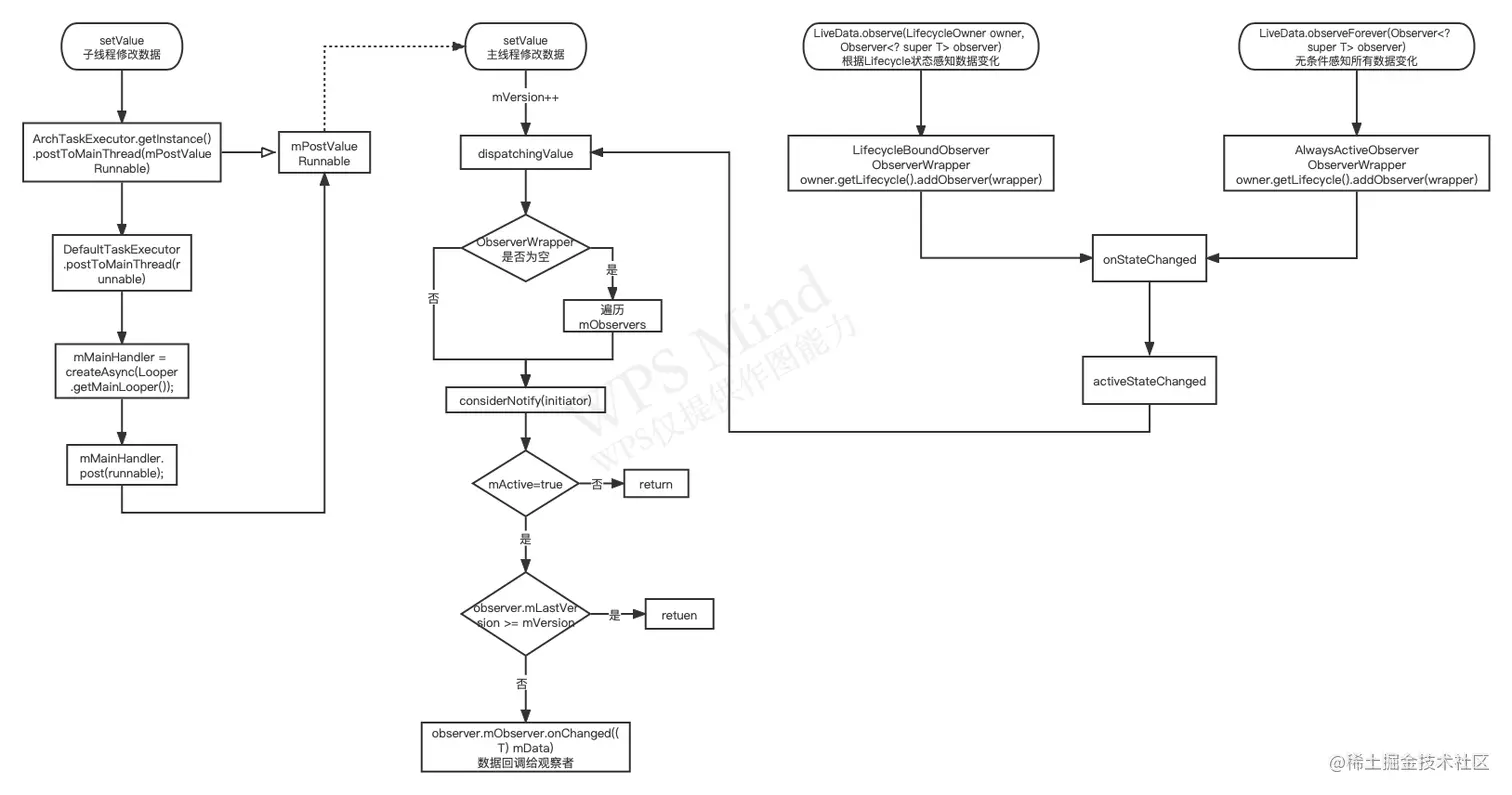 而在postToMainThread中传入的Runnable中,最红也调用了setValue,接下来的逻辑就和主线程中修改数据一致了。