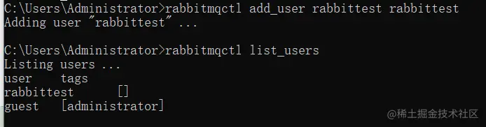 那么在命令行下创建一个用户,创建用户的命令是:rabbitmqctl add_user [username] [password]