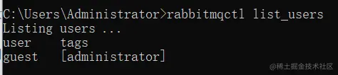 用命令查询一下RabbitMQ的注册用户:rabbitmqctl list_users 如下图: