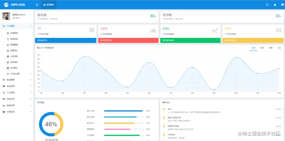 JNPF.java采用SpringBoot框架和SpringCloud框架,springboot框架的特点在于简化配置,快速开发,再在搭配上代码生成器,让不懂代码的人也能做到快速开发软件。Springboot也有良好的扩展性,可以将springboot项目拆分为springcloud微服务,springcloud是一套目前完整功能的微服务框架。