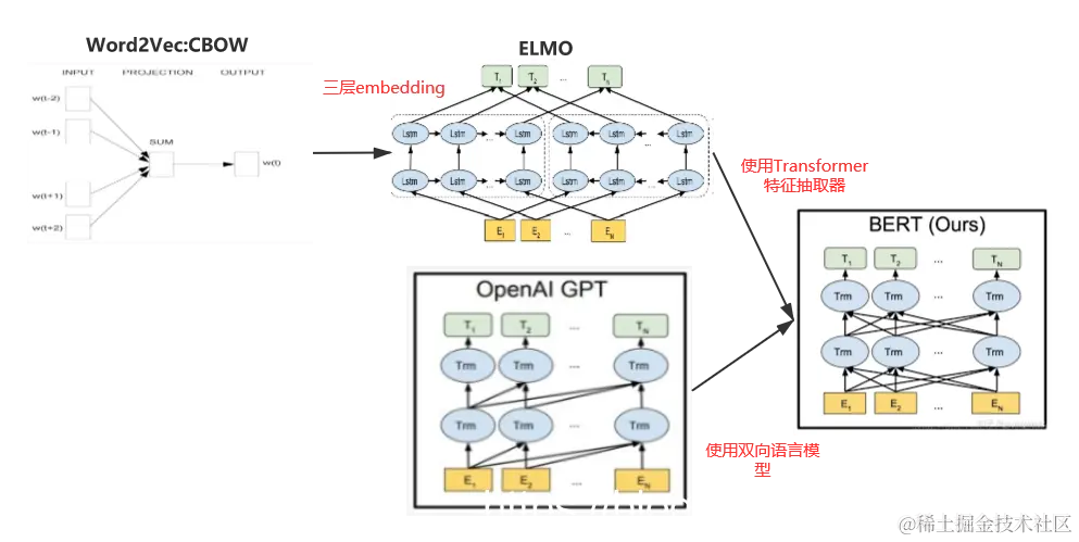 来张全家图看看Word2Vec、ELMO、GPT和BERT的关系吧: