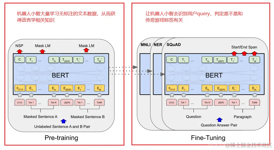 之前咱们通过一个非常简单的例子讲解了下BERT模型的两阶段技术:预训练Pre-Training和微调Fine-Tuning技术。这里咱们再回顾下。拿上一篇识别一段话是不是属于传奇游戏标签来举例。假如我们有个机器人小智,现在我们希望小智能帮我们完成这样一个任务:我们给小智输入一句话(可能是用户的搜索),小智就能判断这句话是不是对传奇游戏标签有兴趣。