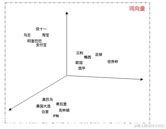 通过Word2Vec技术我们可以在低纬空间上表示文本。我们可以通过计算词向量空间中的距离来表示语义的相似度。