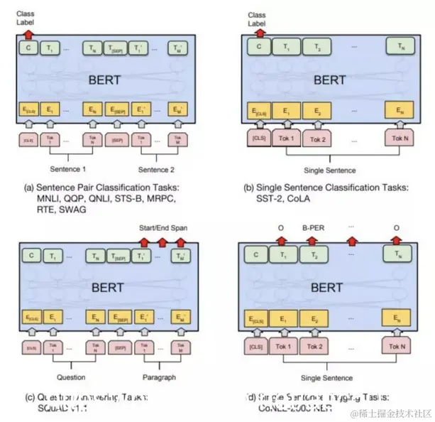 BERT同时支持特征补充和微调的方式来对接上游任务。一般选择微调的方式。之前说过,BERT不仅效果好,而且通用性很强。针对不同类型的NLP任务,如何改造BERT从而对接上游任务呢?