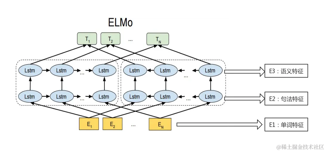 关于ELMO模型具体怎么通过左右两个双层的LSTM网络来学习句法特征和语义特征,这里做简要说明。LSTM是循环神经网络RNN的变种,要讲的话又是超长的知识分享。这里大家只需要明白ELMO使用LSTM作为特征抽取器来抽取特征就行了。