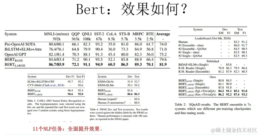BERT集百家之长,同时使用了Transformer作为特征抽取器,还使用了上下文共同来表示词,所以是集大成者。而BERT的效果也是极其出色的。BERT在11个NLP任务重效果有很大的提升。