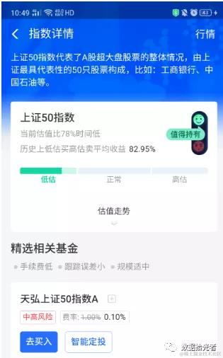 关于选择低估的指数基金再说一些吧,支付宝基金页面会显示指数目前处于的区间。比如支付宝下面这个页面,就会显示目前上证50指数处于低估区间。这个区间买入可能会有不错的收益。
