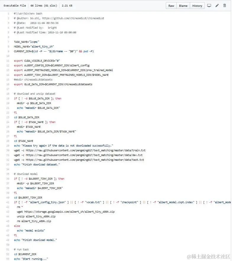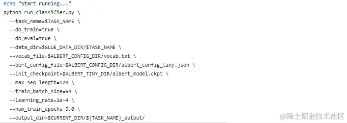 对于我这种“拿来主义者”来说,再牛逼的模型第一步永远都是先跑通它,至于优化的先放一放。跑通它不仅能提升自信心,最实际的作用就是能快速实现项目上线。因为我需要完成文本分类任务,所以通过上面的github地址下载项目后,在集群上跳转到albert_zh目录下,执行sh run_classifier_lcqmc.sh命令即可跑起来。因为项目没有句子分类任务,只有个类似的句子关系判断任务,所以先跑通这个任务,后期再根据这个任务的代码来改就行了。