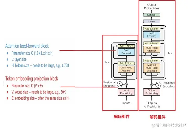 Transformer的参数来源主要有大块:第一块是token embedding映射模块,参数量占比为20%,第二块是attention层和前向反馈层FFN,参数量占比为80%。