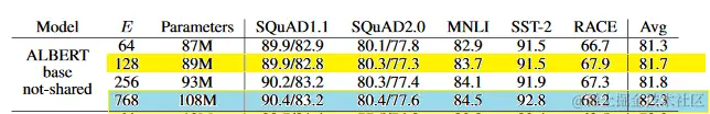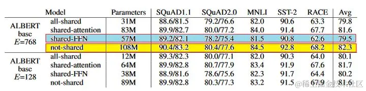 当映射到低维空间E=768时,对比不共享参数和共享FFN层的参数可以看出,参数减少了近50%,这也是导致模型效果下降的主要原因。而共享attention层的参数则对模型效果影响较小。