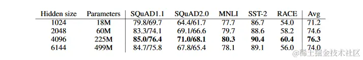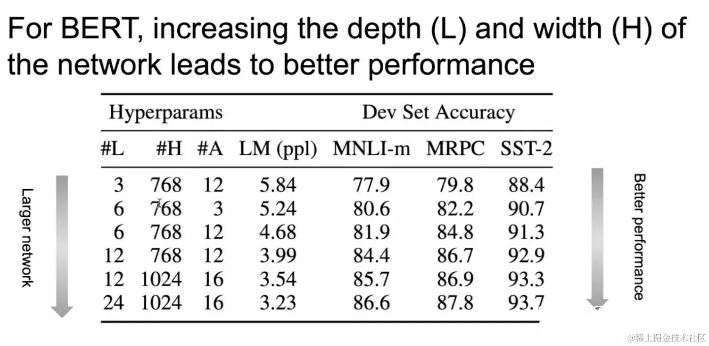 同样的情况也出现在BERT上,随着网络变深变宽使得模型的效果得到提升: