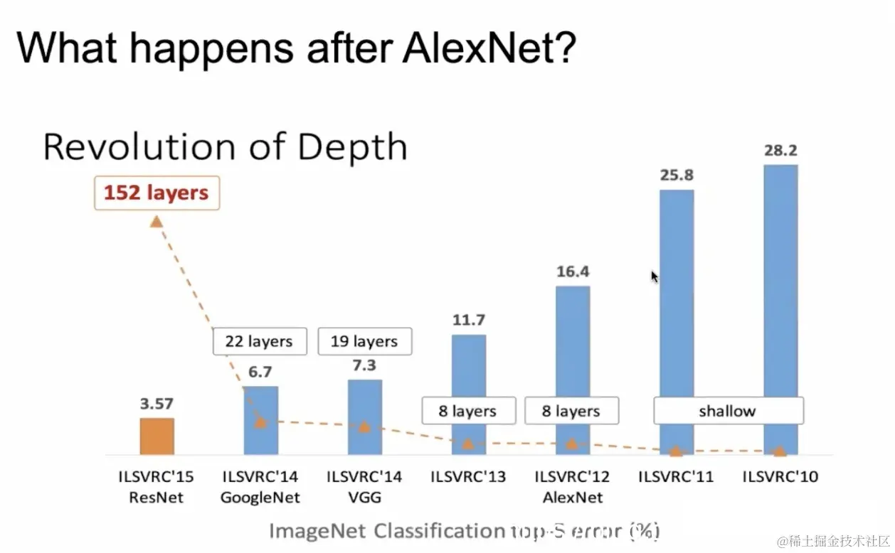 自从深度学习引爆计算机视觉领域之后,提升模型性能最简单也最有效的一个方法就是增加网络深度。下图中拿图片分类任务举例,可以看出随着网络层数不断增加,模型的效果也会有很大提升: