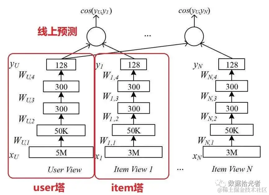 DSSM深度语义匹配模型最早是应用于NLP领域中计算语义相似度任务。因为语义匹配本身是一种排序问题,和推荐场景不谋而合,所以DSSM模型被自然的引入到推荐领域中。DSSM模型分别使用相对独立的两个复杂网络构建用户相关特征的user embedding和item相关特征的item embedding,所以称为双塔模型。下面来一张酷炫的双塔图镇楼:
