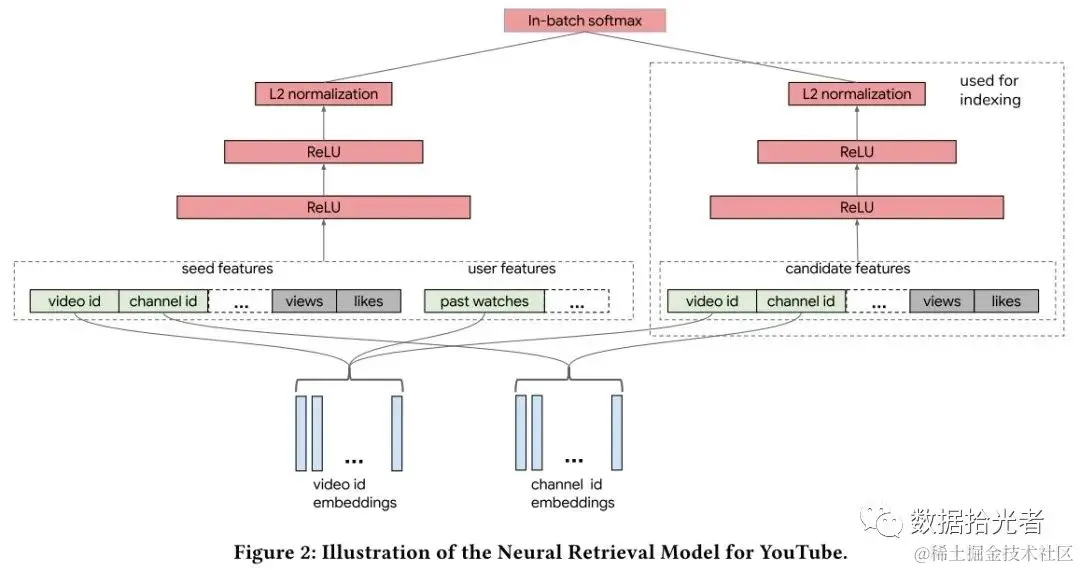 2019年谷歌推出自己的双塔模型,文章的核心思想是:在大规模的推荐系统中,利用双塔模型对user-item对的交互关系进行建模,从而学习【用户,上下文】向量和【item】向量的关联。针对大规模流数据,提出in-batch softmax损失函数与流数据频率估计方法更好的适应item的多种数据分布。利用双塔模型构建Youtube视频推荐系统,对于用户侧的塔根据用户观看视频特征构建user embedding,对于视频侧的塔根据视频特征构建video emebdding。两个塔分别是相互独立的网络。