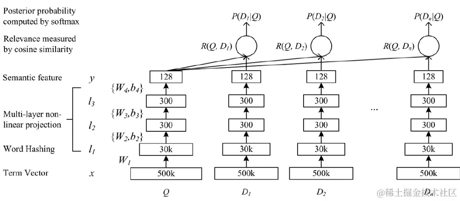 最下面的Term Vector到Word Hashing将词映射到3W维的向量空间中。然后分别经过两层300维度的隐藏层,最后统一输出128维度的向量。
