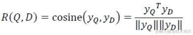 现在我们把query和doc统一转换成了两个128维的语义向量,接下来如何计算它们的语义相似度呢?通过cos函数计算这两个向量的余弦相似度就可以了,公式如下: