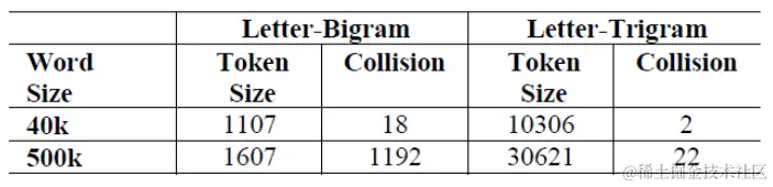 可以看出在50W词的词典中如果使用2-gram,也就是两个字母的粒度来切分词,向量空间压缩到1600维,产生冲突的词有1192个(这里的冲突是指两个词的向量表示完全相同,因为单词储量实在有限,本来想找几个例子说明下,结果没找到)。如果使用3-gram向量空间压缩到3W维,产生冲突的词只有22个。综合下来论文中使用3-gram切分词。