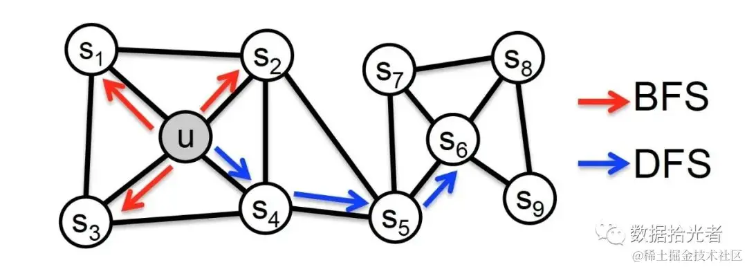 这里通过一个例子说明使用BFS搜索导致图中不同位置(这里的不同位置是指节点在图中是位于中心还是边缘)节点的Embedding差别很大。对比上图中的节点u和节点S9,其中u是局部网络的中心点,而S9是一个边缘节点。当网络采用BFS搜索策略进行随机游走时节点u因为处于局部网络的中心所以会被多次遍历到,而且会和直接相连的节点S1-S4等节点发生联系。但是边缘位置的节点S9无论从遍历次数还是邻接点的丰富程度上都不如u,所以最终的结果是节点u和节点S9两者的Embedding差异会非常大,从而一定程度上达到了区分物品的目的。\