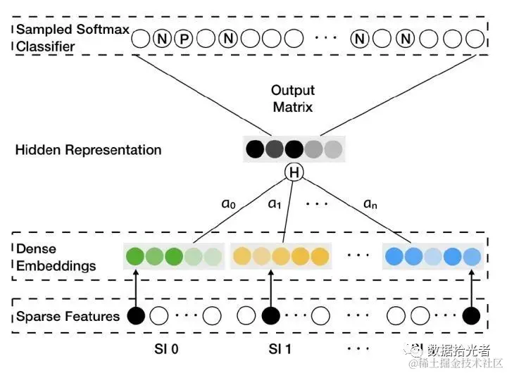 图中的隐藏表示层(HiddenRepresentation)就是对不同Embedding进行加权平均操作的神经网络层,将加权平均后的Embedding向量直接输入Softmax层,通过梯度下降的反向传播算法就可以得到每个Embedding向量的权重a_i。这里需要注意的是EGES模型采用了e^a_i来表示对应Embedding的权重a_i,目的是既可以避免权重为0,又可以在梯度下降的过程中使用e^a_i良好的数学性质。\
