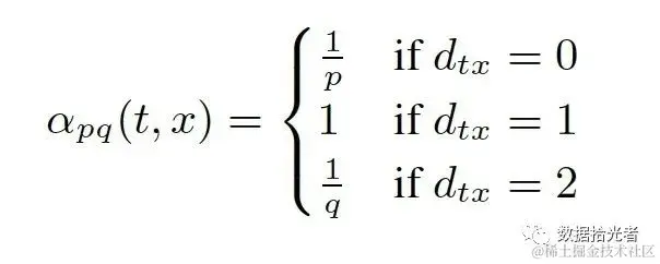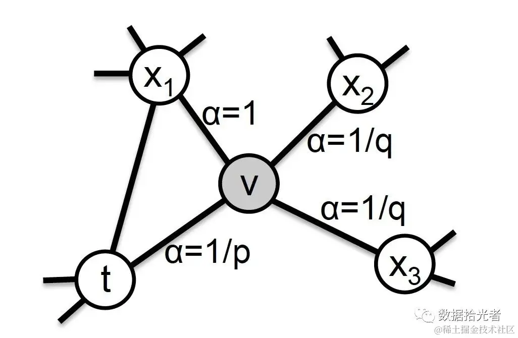 说完同质性和结构性,那么在Node2vec算法中具体如何控制BFS和DFS的倾向性呢?主要通过节点间的跳转概率。下图展示了Node2vec算法从节点t跳转到v之后,在v节点跳转到周围节点的跳转概率:\
