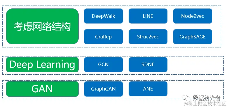总的来说,Graph Embedding主要包含以下不同的分类以及对应的算法模型。GraphEmbedding算法全家桶如下图所示: