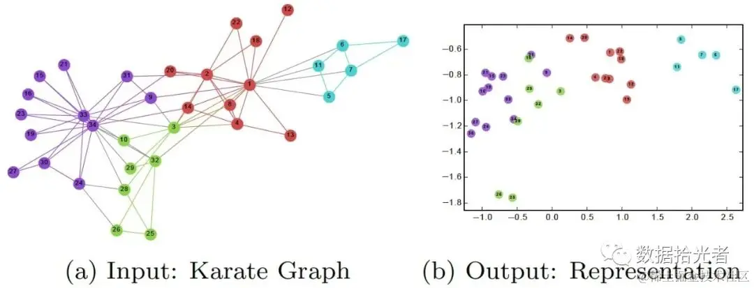 Graph Embedding的中心思想是找到一种映射函数将网络中的每个节点转换为低维度的潜在表示,也就是使用低维、稠密的向量来表示网络中的节点。Graph Embedding的一个输入和输出如下图所示:\