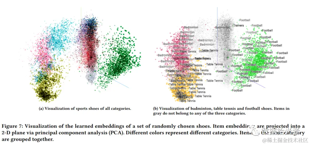 下图是论文中将EGES模型得到的商品的Embedding通过PCA降维能达到很好的聚类效果图:\