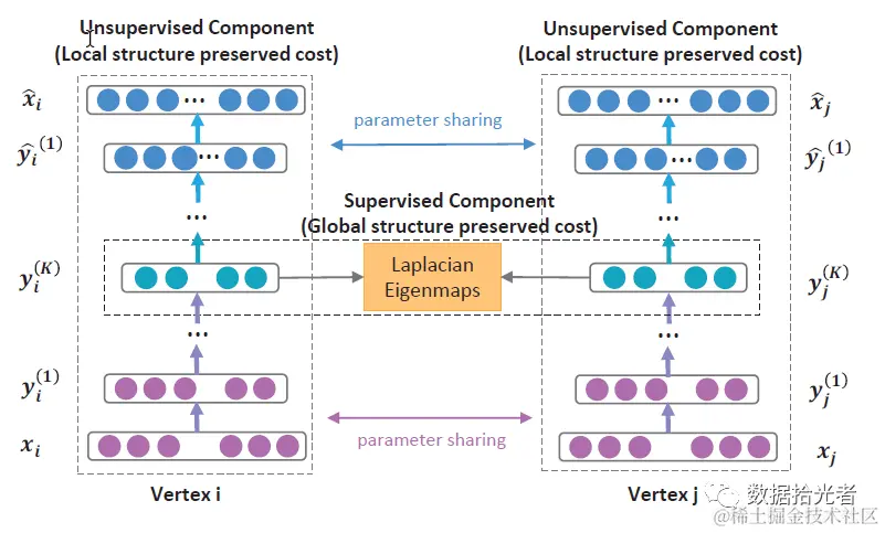 上图中左边是一个自动编码器结构,输入是邻接矩阵,输出则是重构后的邻接矩阵。通过优化重构后邻接矩阵的损失函数可以保留节点的全局结构特性。图中绿色的y_i就是我们需要的Embedding向量,模型通过一阶损失函数拉近相邻接节点的Embedding向量距离,从而保留节点的局部结构特性。注意论文图中的Global和Local画反了。\