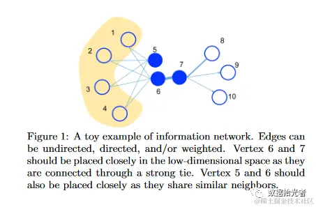 2014年DeepWalk打开Graph embedding的大门之后,2015年微软紧跟其后提出了LINE(Large-scale InformationNetwork Embedding)模型。LINE的核心思想是通过一阶相似度(First-order proximity)和二阶相似度(Second-orderproximity)明确定义了如何表征图中节点的相似度。通过下图说明一阶相似度和二阶相似度:\