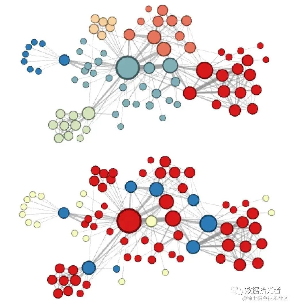 下图是论文中证明Node2vec灵活表达同质性和结构性特点的节点可视化图。可以看出图中上部分通过BFS策略网络更加注重结构性,也就是节点相邻的点之间的Embedding比较相似,更注重微观结构microscope view;而图中下部分则通过DFS策略网络更加注重同质性,也就是中心或者边缘的节点之间的Embedding比较相似,更注重宏观结构macroscope view。\