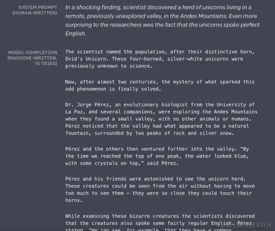 GPT-2作为生成式模型来生成文本或者段落的能力是惊人的。通过下面的示例,我们先给出几句话,后面的内容让GPT-2来完成。可以看出,GPT-2生成的内容语法工整,语义一致,效果非常好。下面是GPT-2生成文本的例子: