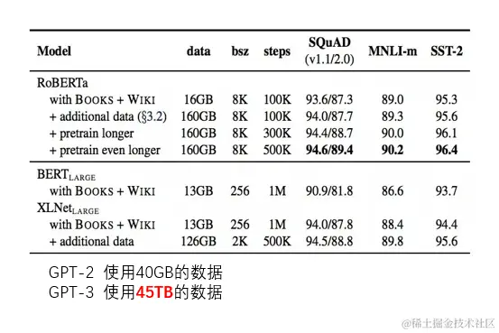 接下来咱们从使用训练数据的角度来看GPT-3到底有多大。BERT-Large使用了13G的数据,GPT-2使用了40G的数据,XLNet-Large使用了接近140G数据,之前说过RoBERTa模型能有很好的效果提升其中的一个重要原因是使用了将近176G的数据。这些在GPT-3面前就像小儿科一样,因为GPT-3直接使用了45TB的数据来预训练。下面是NLP领域各种模型使用数据量级对比图:
