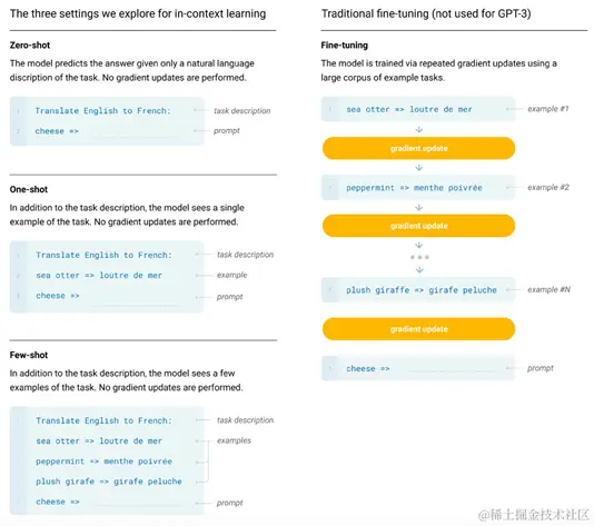 GPT-3可以像人类那样完成NLP任务。GPT-3的作者用训练好的模型去验证不同输入形式的推理效果,主要包括Zero-shot、One-shot和Few-shot。通常情况下BERT这类微调模型总是需要一些样例来更新模型的梯度参数从而让模型更加适应当前的任务。但是GPT-3可以通过不使用一条样例的Zero-shot、仅使用一条样例的One-shot和使用少量样例的Few-shot来完成推理任务。下面是对比微调模型和GPT-3三种不同的样本推理形式图: