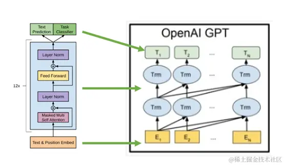 还有一点就是GPT使用单向语言模型。GPT在预训练的过程中仅仅使用语句中的上文。这里通过一个例子说明上下文的概念。我们现在有一句话:“GPT是预训<>和微调的两阶段模型”。现在我们语言模型的目的是预测“预训”后面跟着的词,那么<>之前的“GPT是预训”就代表上文,而<>之后的“和微调的两阶段模型”就代表下文。GPT使用单向语言模型和BERT使用双向语言模型是它俩最大的区别。这里小提一句,GPT后续系列依然坚持使用单向语言模型。下面是GPT预训练模型的网络结构图: