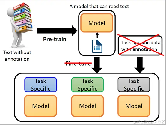 GPT是典型的预训练+微调的两阶段模型。预训练阶段就是用海量的文本数据通过无监督学习的方式来获取语言学知识,而微调就是用下游任务的训练数据来获得特定任务的模型。之前举过一个例子来形容预训练和微调的关系,我们从幼儿园到高中就像预训练过程,不断学习知识,这些知识包罗万象包括语数英物化生等等,最重要的特征就是预训练模型具有很好的通用性;然后读大学的时候需要确定一个专业方向作为未来的职业,所以就会去重点学习专业知识,从而让我们成为更加适合某个专业方向的人才,最重要的特征就是具有极强的专业性。通过这个例子大家可以理解预训练模型和微调两阶段的差异和联系。\
